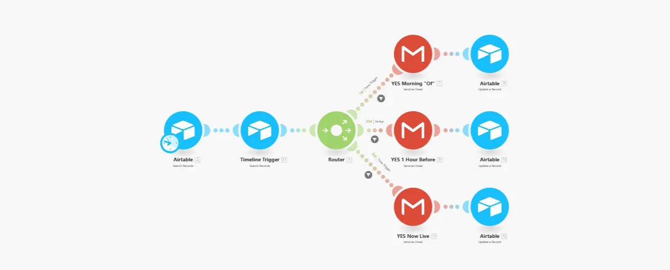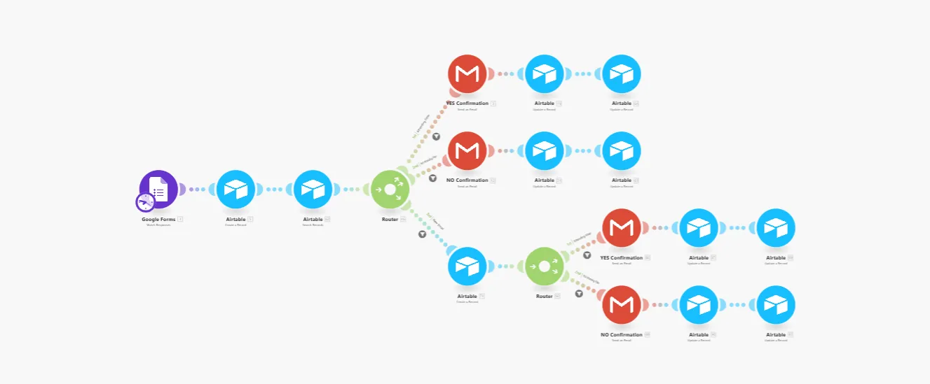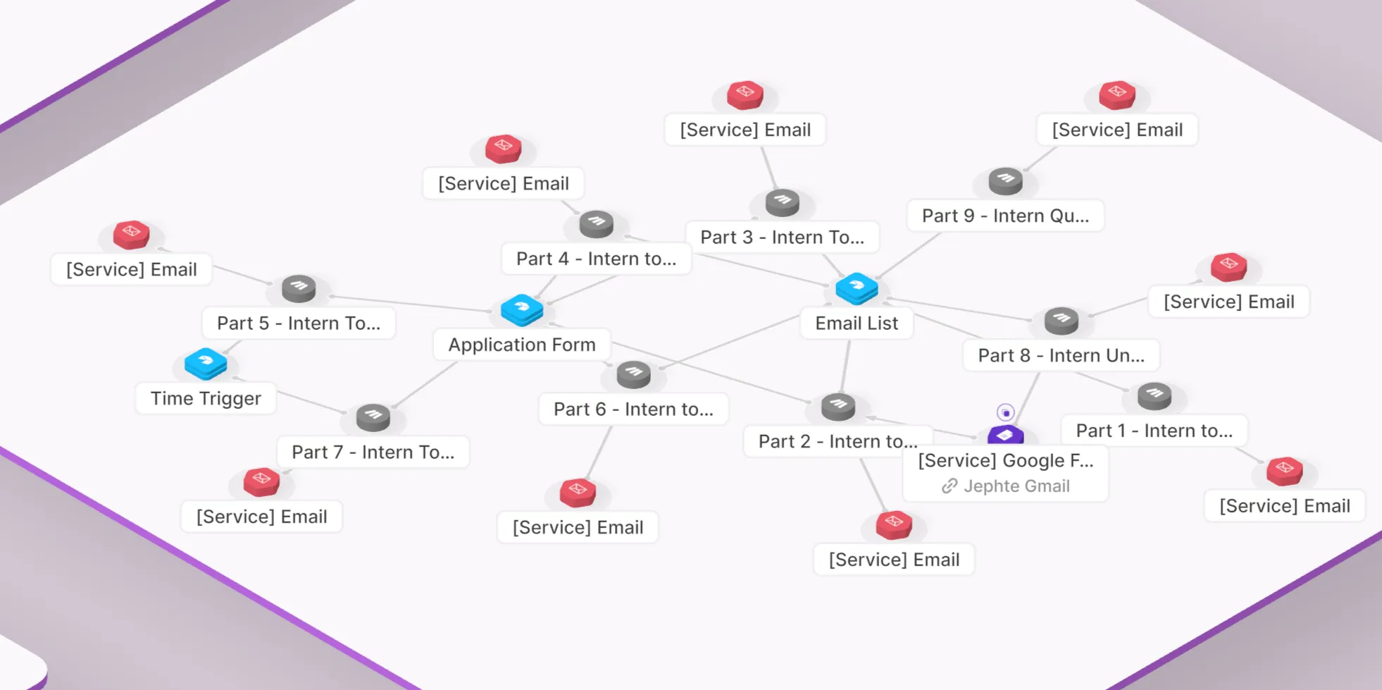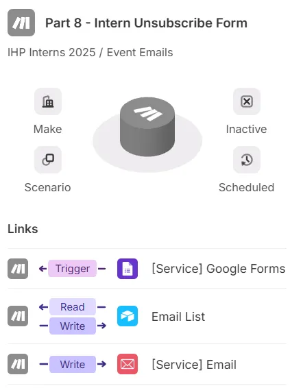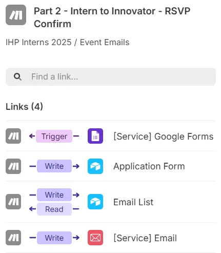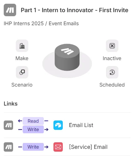 I led the development of a fully automated onboarding workflow for IHP interns, streamlining the process from acceptance to role-specific training. Using Airtable, Make.com, and Google Workspace, we built a scalable system to track personal info, contracts, availability, assignments, and training progress across departments. Role-based email sequences, training content delivery, and real-time status tracking enabled seamless intern onboarding and engagement across multiple technical and non-technical teams. No media is available for this project, as it contains personal and sensitive information about interns and employees at IHP.