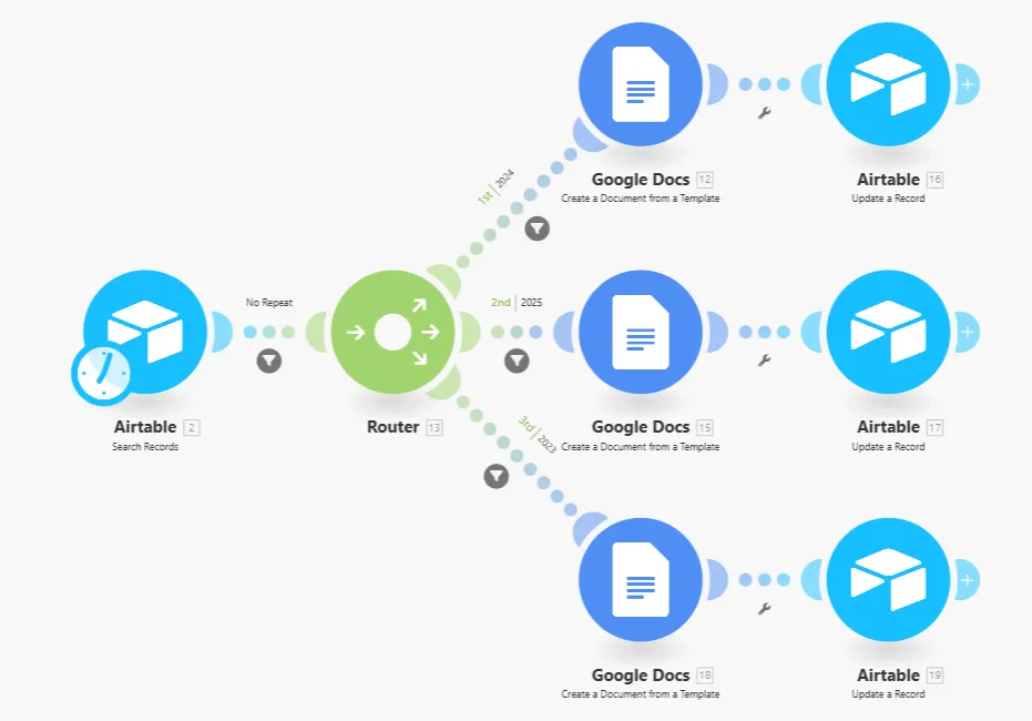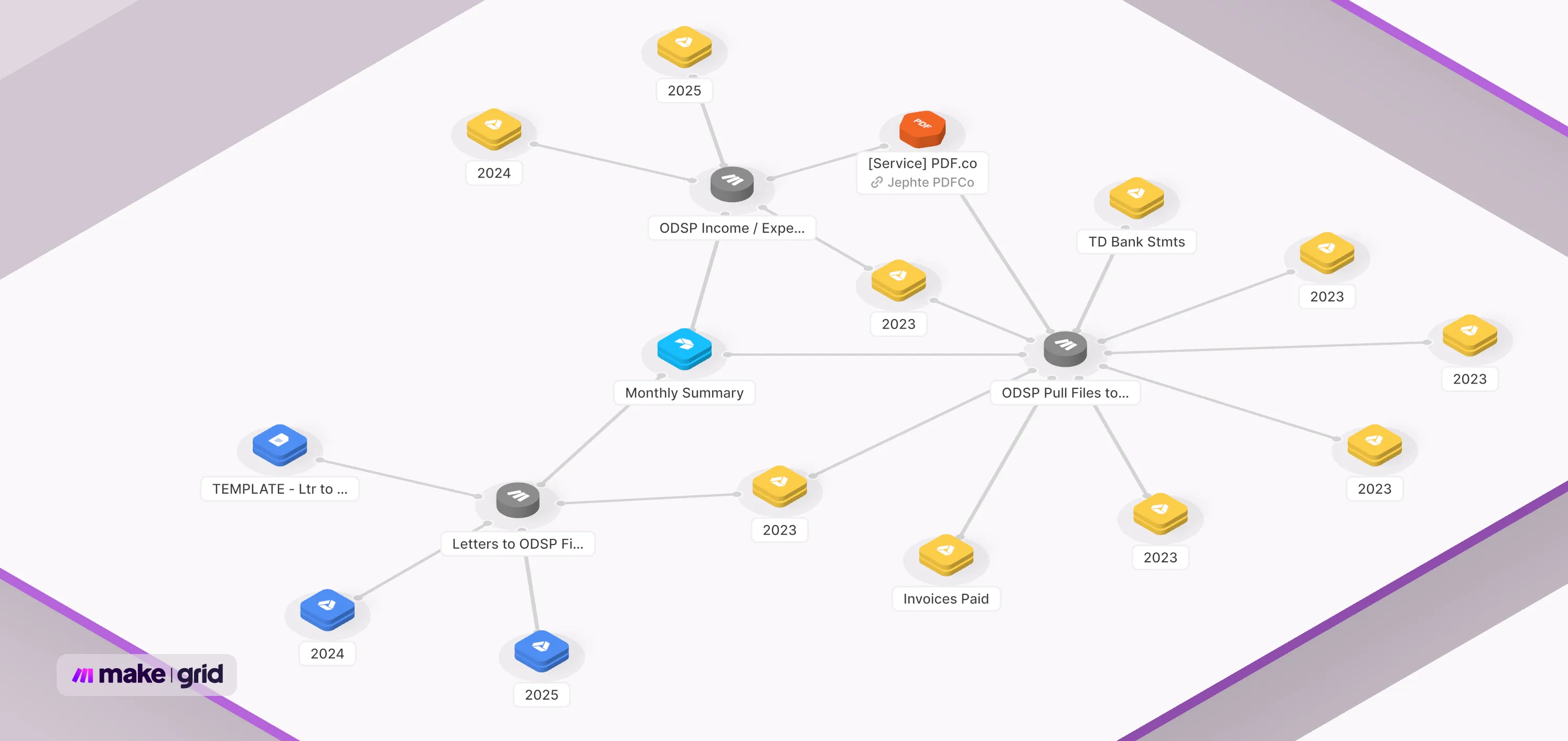 I designed and implemented a semi automated system for generating and submitting Business Income & Expense reports. The solution pulls categorized data from Airtable, fills PDF forms with signatures, builds Google Docs cover letters, collects supporting files, and merges all assets into a finalized monthly report. Built using Make.com, Google Drive, and PDF automation tools, this system reduces manual reporting work while ensuring accuracy and compliance for recurring government submissions.